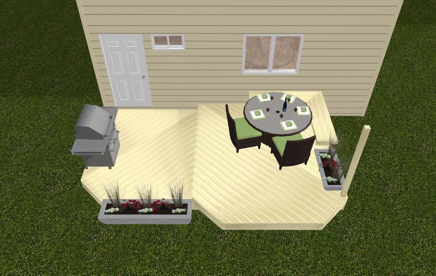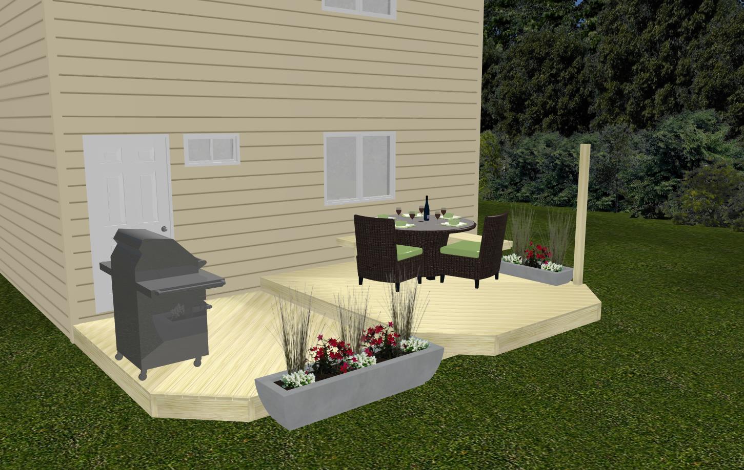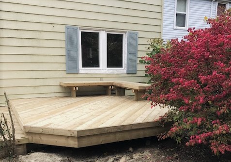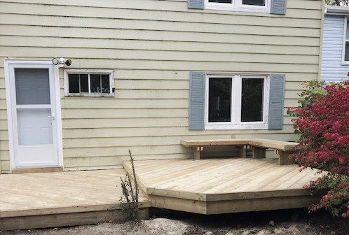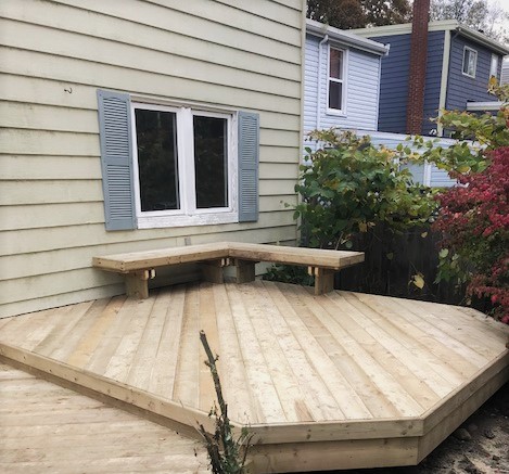 For these Halifax homeowners we demolished and hauled their existing deck including railings and privacy fence. We built their new deck with pressure treated decking boards laid in a diagonal pattern. Their deck design selection included an 18" high pressure treated bench with 4×4 bench legs bolted to the deck frame for additional outdoor seating. We used 6″ × 6″ treated timber for the deck columns and poured 48" deep concrete footings for the new deck design.