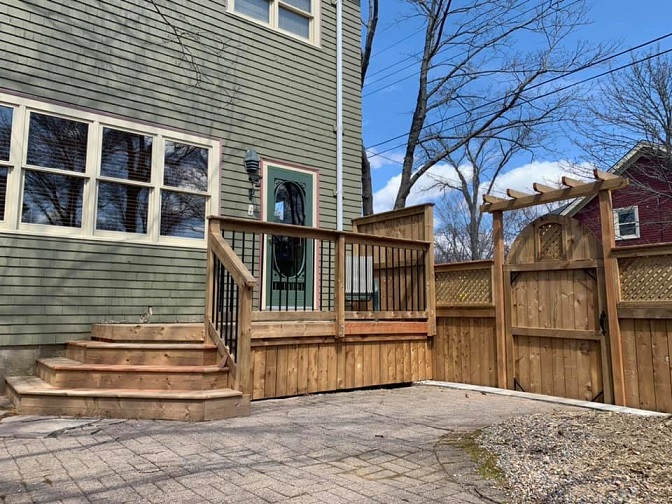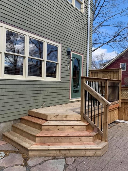 We demolished the Halifax homeowners existing rear entry deck structure. We replaced the structure with a new 5′ × 12′-6" brown pressure treated rear entry step including flared stairs, pressure treated with black aluminum baluster railing, and solid board skirting.