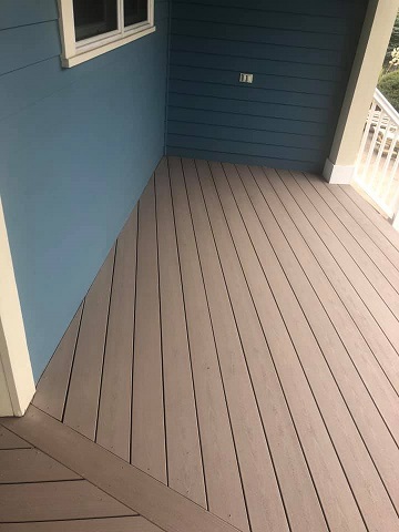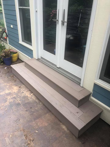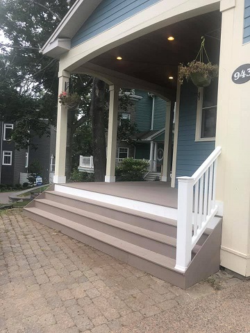We demolished the existing stairs, structure, and decking at front entry. We supplied and installed new composite decking, stairs, and radiance railing. As well as, demolished and hauled two existing box steps at the rear entry and replaced with composite decking materials.