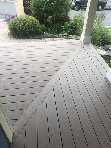 These Halifax homeowners chose low maintenance, TimberTech Sandy Birch Terrain composite decking, stairs and skirting at stairs with white radiance railing. The rear entry stairs were also replaced with low maintenance TimberTech Sandy Birch Terrain composite box stairs.