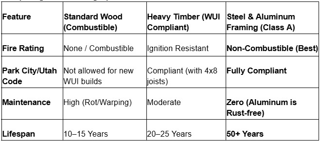 If you prefer the look of wood, the Utah WUI code allows for Heavy Timber construction, which relies on the "char factor" (large wood members burn slowly on the outside, protecting the structural integrity of the core).