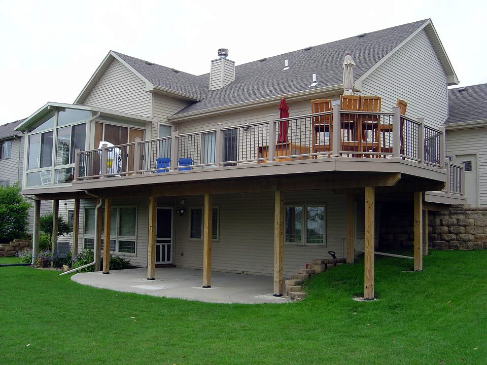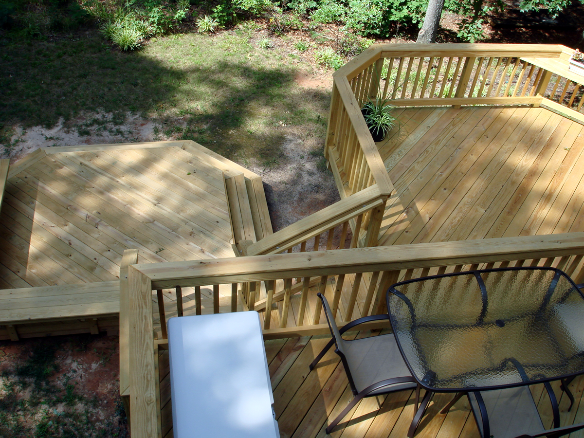 We still build with pressure treated lumber and it can make a great outdoor living space. This is an example of Archadeck custom designed and custom-built wood deck incorporating some of the Archadeck elements. This deck is constructed out of pressure-treated wood and includes diagonally-oriented decking, parting board, custom wood deck rails and octagonal shape. It also is multi-level with a lower deck and bench stairs that leads you out into the yard. Instead of one big long rectangular deck; this home now has several deck spaces creating a more interesting and usable structure to enjoy outdoor living.
