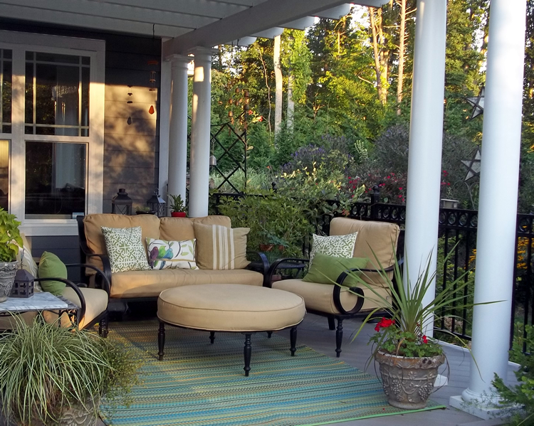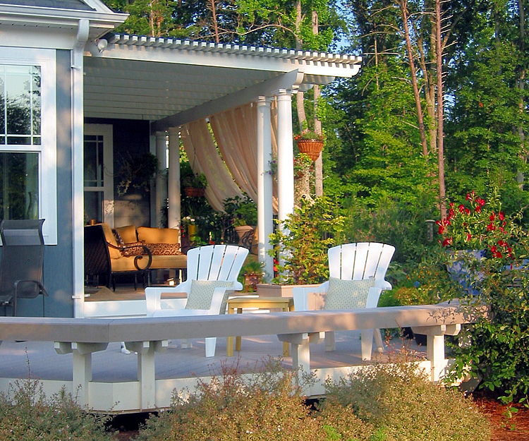 Comfortable furnishings and a pergola make this deck the perfect spot for Sunday relaxation.
