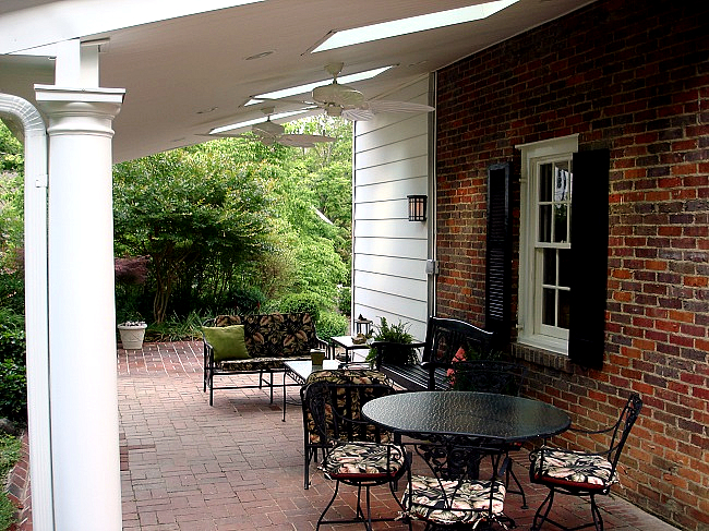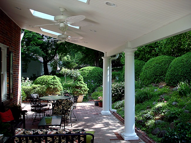 Ceiling fans, recessed lighting and skylights make this covered patio an extension of the existing home.