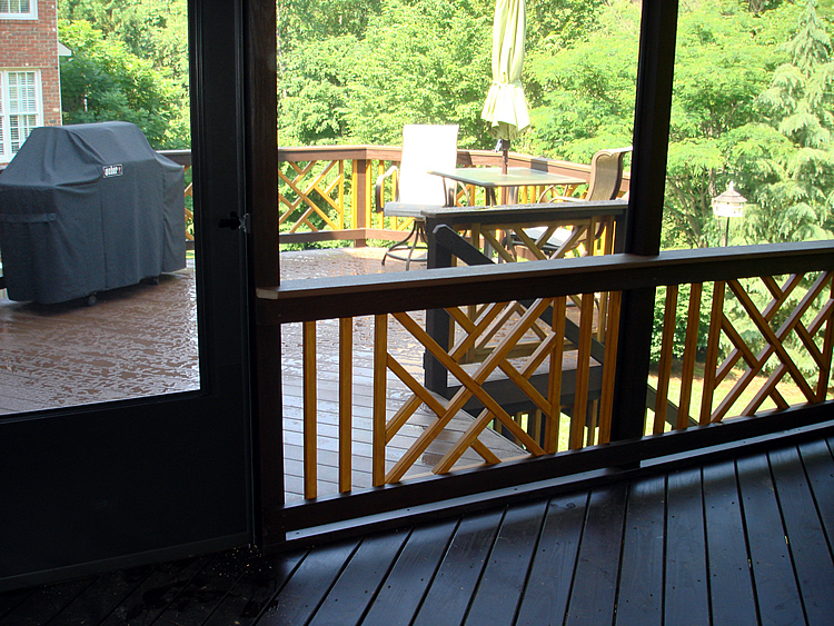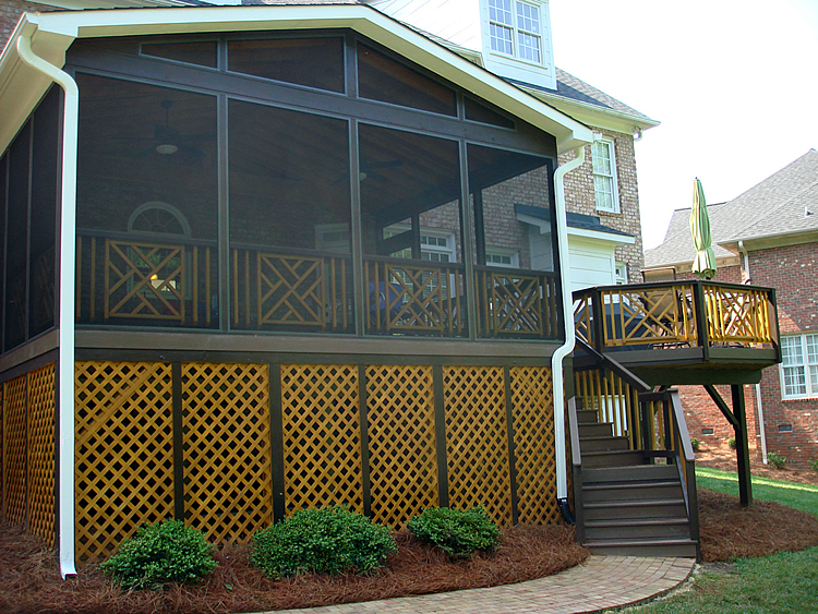 This project in an upscale Greensboro development used AZEK decking, rail cap and edge bands and also AZEK material on the stairs. Contrasting the warm brown is the railing in Chippendale pattern and the lattice below the elevated porch. To add to the warm colors, the windows are bronze with charcoal screen color. The decking boards are laid in a diagonal pattern contrasting angles where the deck meets the screened porch. The screen panels are upgraded with PGT windows to give them a longer use time into the Fall and Winter. We also added a new door into the home and a new kitchen window.