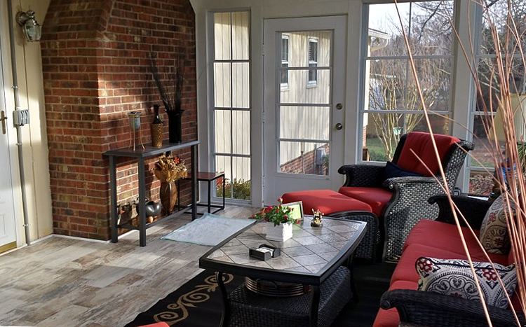 As we start to sketch out project ideas, we always look for existing features in the home that are especially attractive or useful and we integrate them into the design. In this case, there is a large, red brick fireplace that becomes a nice architectural feature in the house wall of this Eze-Breeze porch. The architecture of the home also allowed us to build the porch with an open gable roof which lets in so much light and contributes to a very open feel.