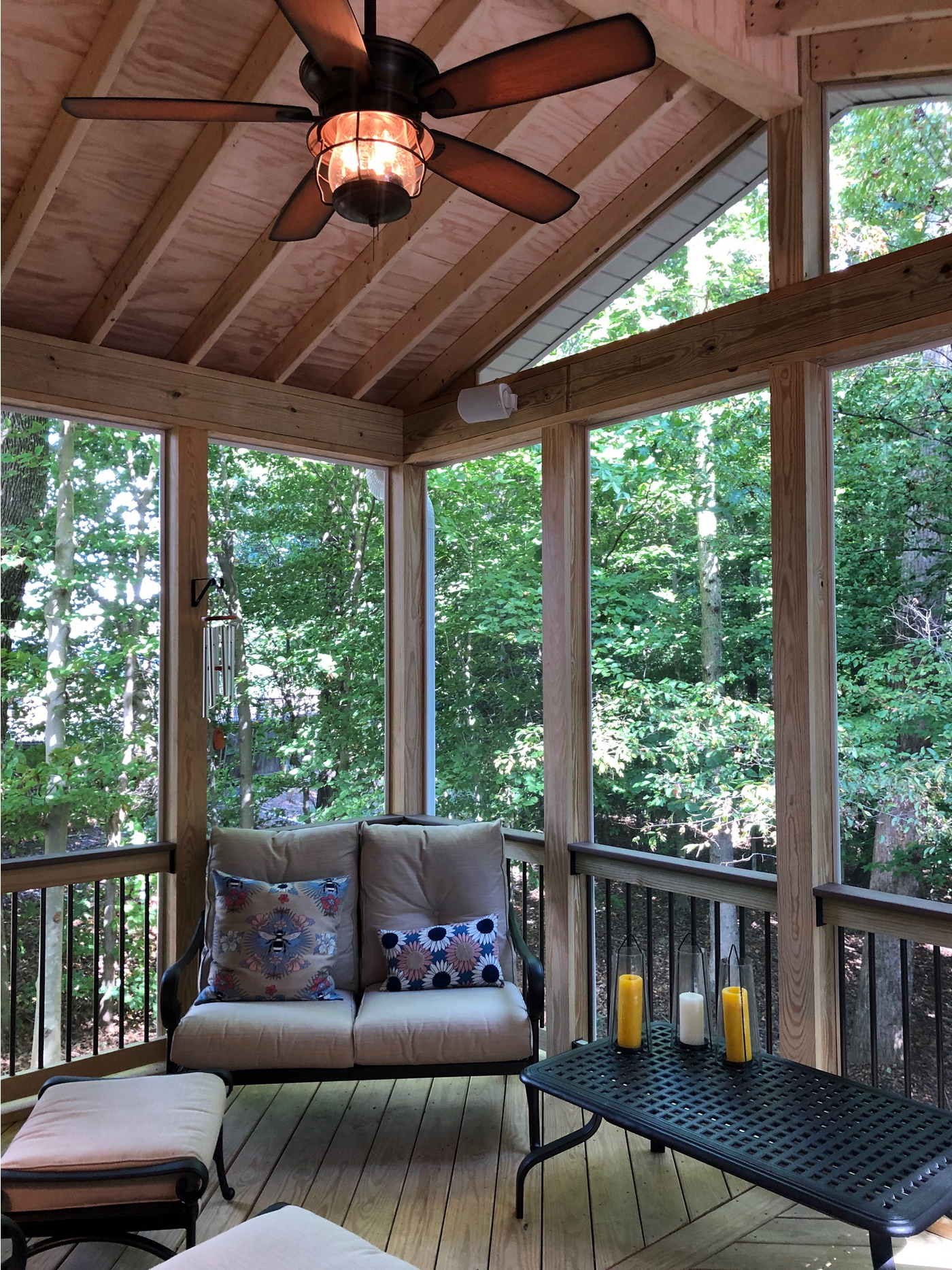 A pressure treated southern yellow pine screened room could be the solution for many folks. The color and warm look of an all wood room is rustic and cozy. Inside the room the rafters are left exposed to create a rustic look with a pine ceiling.The addition of a ceiling fan keeps a breeze stirring even on the hottest of southern summer days. With the addition of some comfortable chairs a table and you have instant entertaining.space for friends and family. Just look at how gorgeous the view from the new screened porch is!