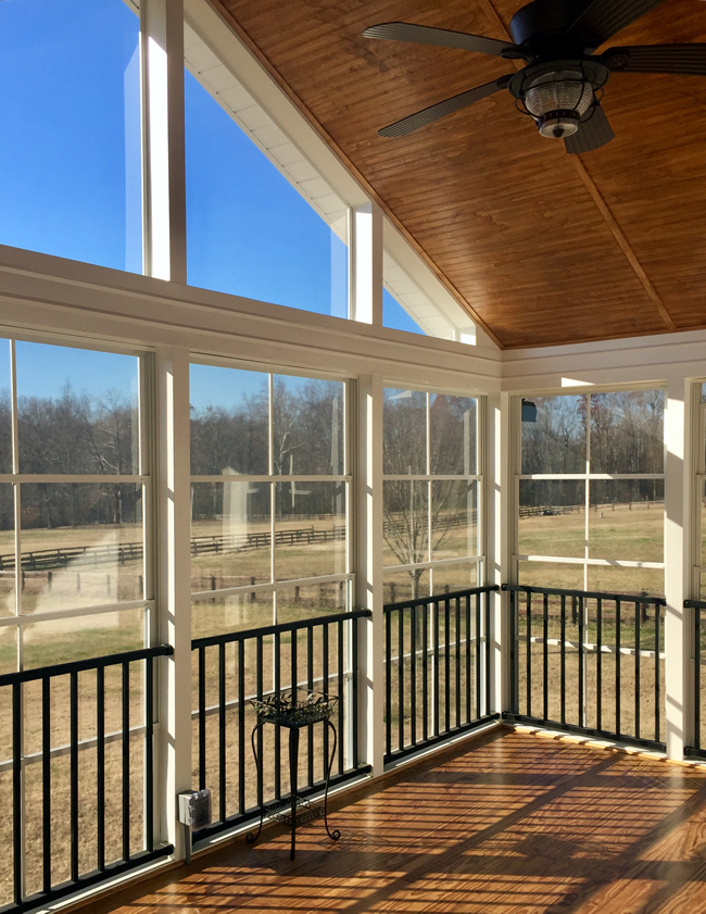 These homeowners wished to sit outside during all four seasons and enjoy that view. They chose to add an Eze-Breeze window room with an open gable roof allowing the light to stream into the room. The ceiling is a tongue and groove beaded plywood. The floor is also a stained tongue and groove pine flooring. Railing is needed in the room by building code since the room is so high off the ground. The deck is redecked with AZEK decking for low maintenance. An addition of powder coated aluminum railings in black for the two sets of stairs that offers quick access to the pasture and side yard. This Eze-Breeze porch faces south and will get sun all day long. A ceiling fan will bring in cool air during the summer months when the room becomes a screen porch. This truly is a multi-purpose outdoor living space for all seasons.