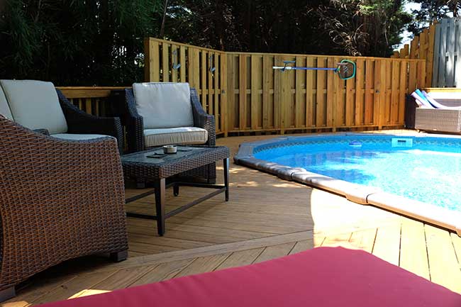 With no detail left undone, the offset fencing provided privacy without becoming too claustrophobic. And, the beautiful deck flooring was installed in an eyecatching pattern that helped to minimize the warping and wear that come with age.