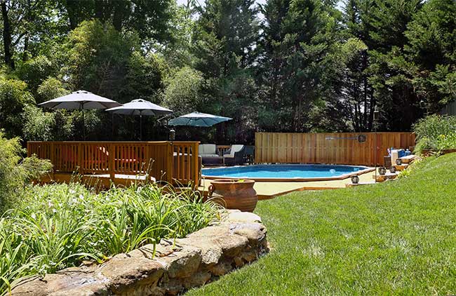 These Greensboro homeowners decided it was time to create the outdoor living space they had been thinking about for some time. The pool needed replacing, so the time was right for a complete redo. They wanted a space that would work in harmony with the surrounding woods and gardens. A space where they could come home from work and recharge. They felt the old fence and deck created privacy but also cut them off from the outdoor environment and felt claustrophobic. The entire space seemed to have been built as an afterthought.