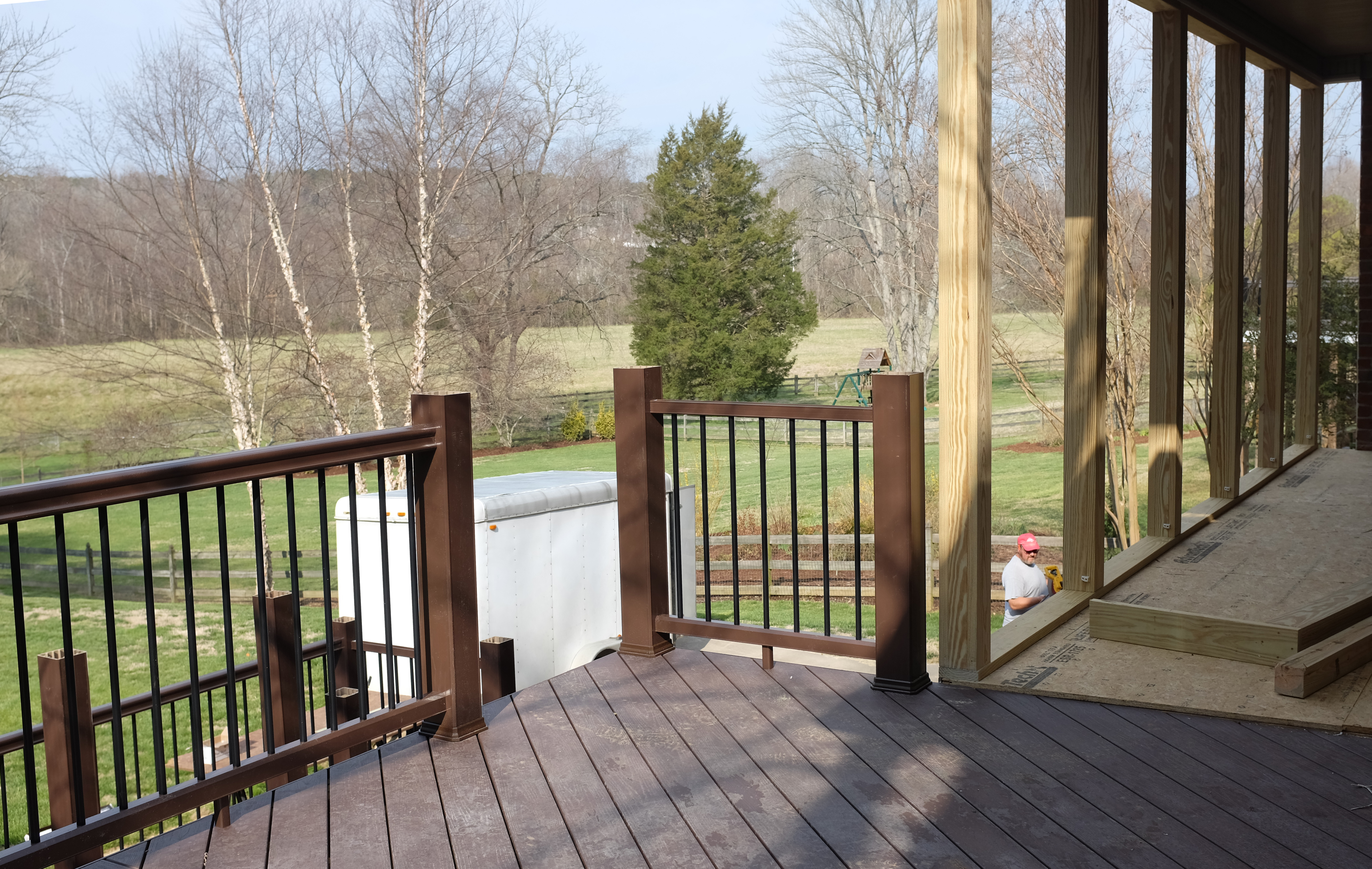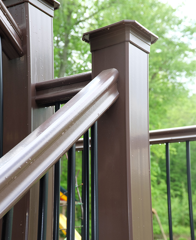 Once the supporting structure for the outdoor living space is complete, a new plywood subfloor is put down as a base in the 3-season room. We install the new Azek planking on the deck at a diagonal for an appealing look. The dark brown Kona with its woodgrain texture looks great, so it’s time to start the railing. RadianceRail by Timbertech is installed, chosen for its smooth lines and hidden hardware. It’s no wonder this railing is one of the most popular railings that Timbertech offers! Custom balusters are no problem – Square balusters in black aluminum are custom-drilled, which takes a good deal of patience and perfection to ensure a tight fit. After the railing is complete, the only thing left to do is to install the Endcaps. This detail puts just the right finishing touch on the handsome, sleek Timbertech railing.