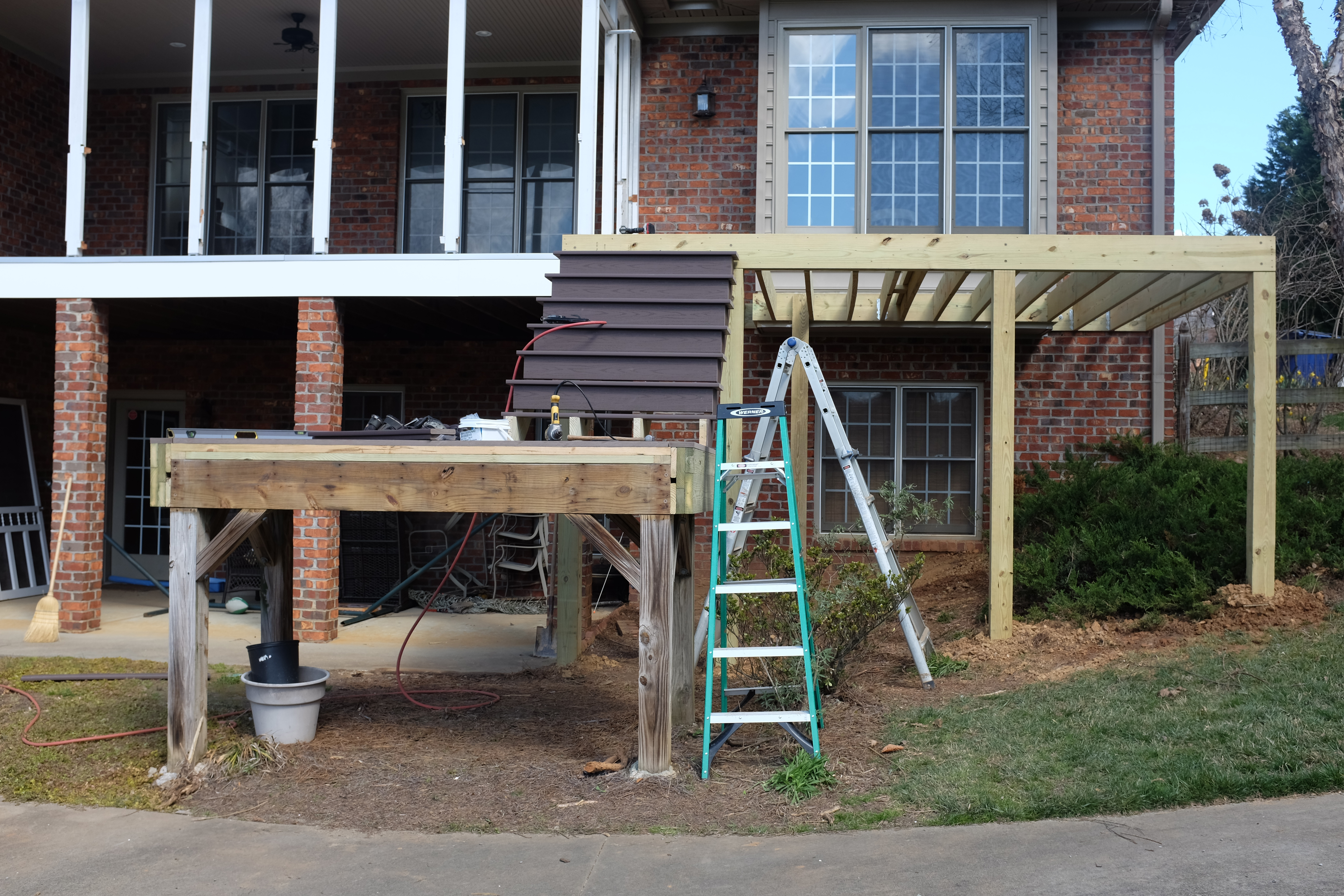 The support posts and floor joists for the outdoor living space have been secured. Archadeck uses only quality lumber and has made it their mantra to not only meet code standards but to exceed these standards for an extremely solid and long-lasting foundation. Quality of materials and workmanship is never compromised. This philosophy even extends to the smallest of details – like the use of weatherproof screws instead of plastic screws on the hip frame.