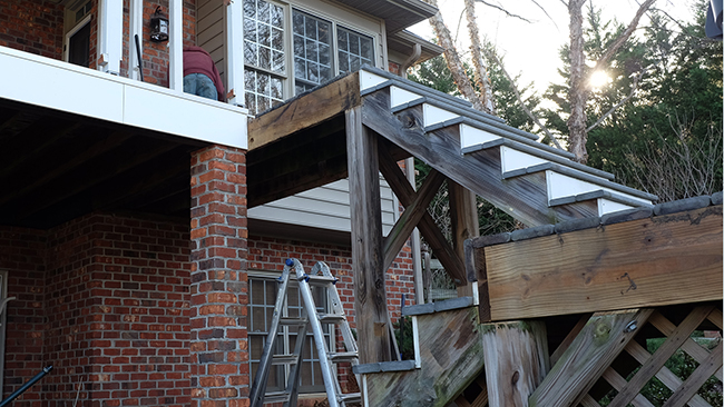 The screening is taken out as well as the railing along the stairway. For now, the old decking is left in place to allow access to the room above. New support posts will be installed to work with the EZE-Breeze windows, and new Timbertech material will replace the white fascia. The dark brown Timbertech will look great with the deck and railing and will create a more cohesive look than the previously white screened porch.