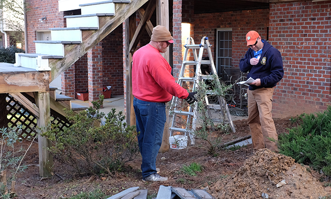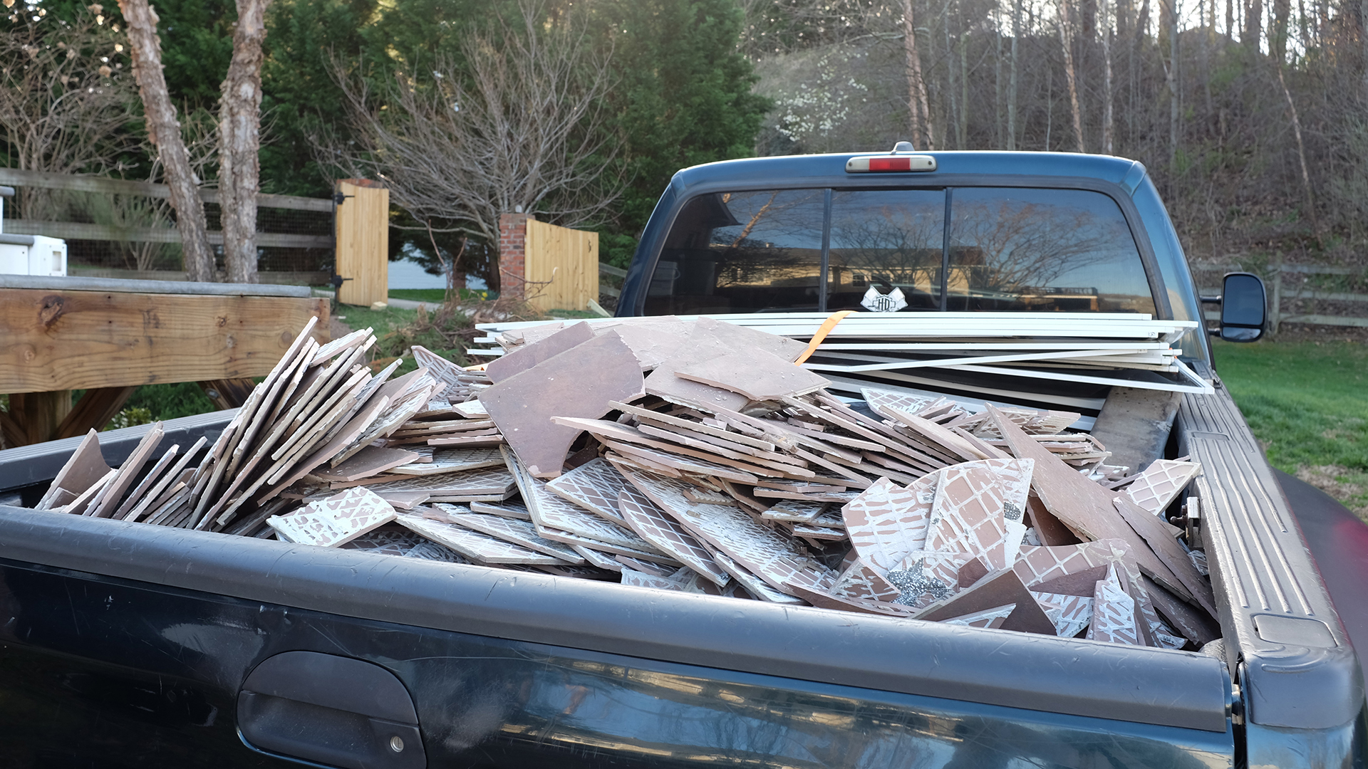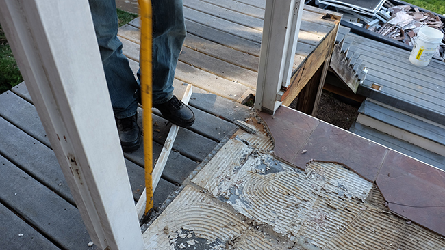 Plans and approvals for this Winston-Salem 3-season room are in place, and we are ready to tackle the demolition and new footings for the outdoor deck. The tile flooring and backer board are being removed and will be replaced with pine tongue-and-groove planking.
