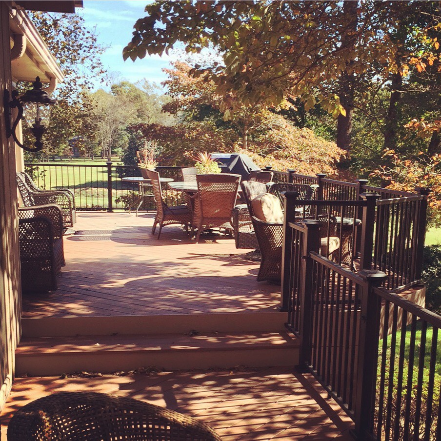 This multi-level composite deck runs nearly the full length of John’s and Nancy’s home in a scenic golf course community. There are separate areas for eating, sunning, relaxing, conversing, and more. Their composite decking will require a minimum of yearly maintenance and upkeep; won’t splinter, fade, or rot over time. The black aluminum railing system incorporates custom square posts, flat post caps, and low-profile square pickets, which will allow John and Nancy an unimpeded view from their deck out into their beautiful yard and the fairway beyond.