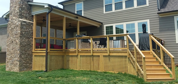 These clients wished for a traditional wood deck, but also wanted a covered space. Archadeck of the Piedmont Triad’s experienced design team gave them both with a deck and covered porch combination. Both the deck and porch are substantial in size, so neither space lacks for usability. The open-air deck creates an ample grilling and seating area or could be staged for just about any outdoor living need. The deck boasts a custom fascia-mounted railing comprised of wood framing and an aluminum picket infill. The entire space features custom wood lattice skirting and trim.
