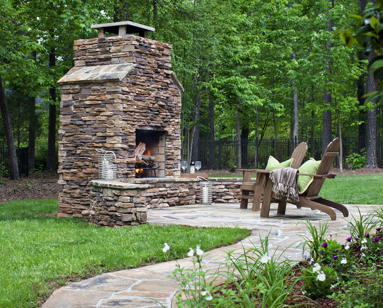 Greensboro flagstone path and patio with stacked stone outdoor fireplace