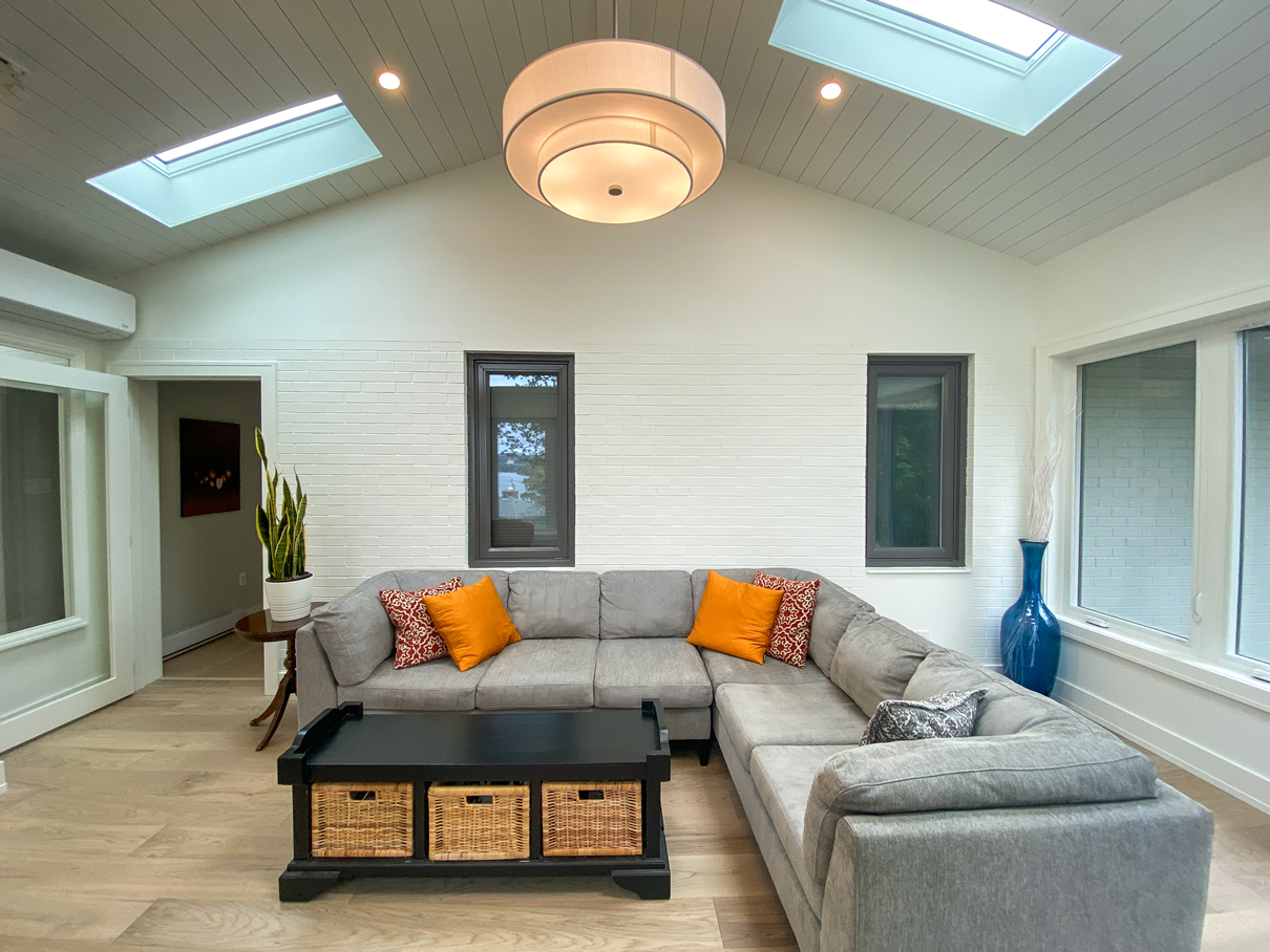 The gable roof with fixed windows, tall windows throughout, and skylights all make this sunroom a bright and airy space to enjoy any day of the year.