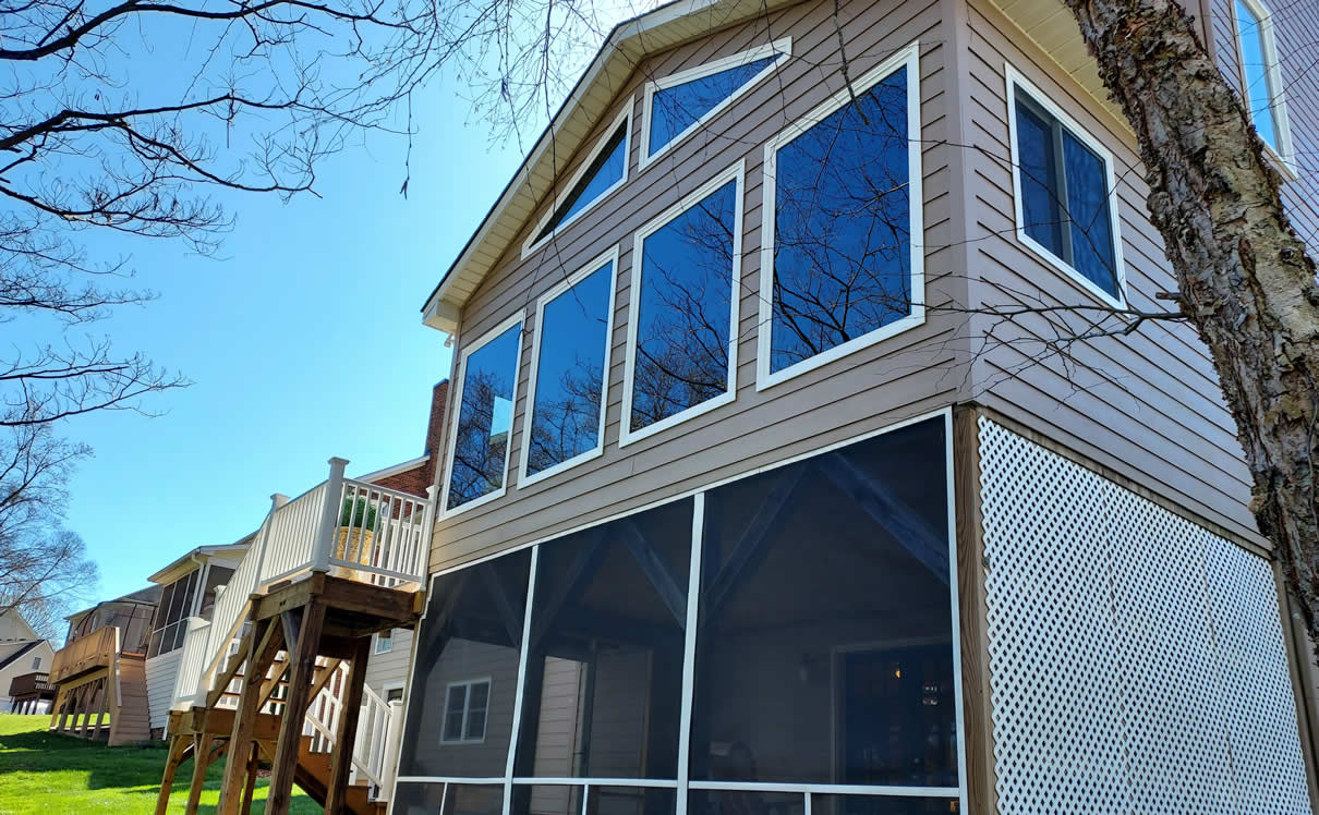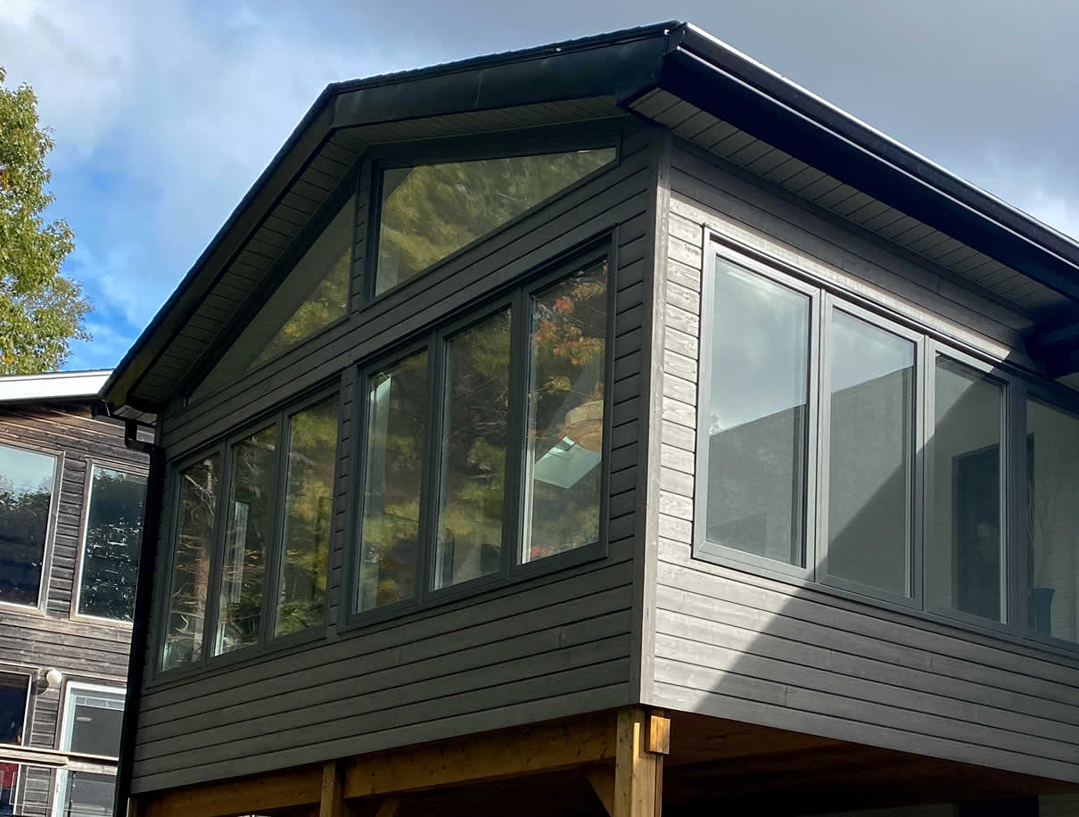 The Archadeck sunroom below is an indoor-outdoor space with premium finishes, such as tall casement windows and hardwood flooring. The addition of indoor furnishings and designer accessories offer this family an additional TV room, or a space to just sit with the windows open on a perfect spring or autumn day. Here again, the tall gable accommodates fixed windows, which maximize the amount of sunlight in the space.