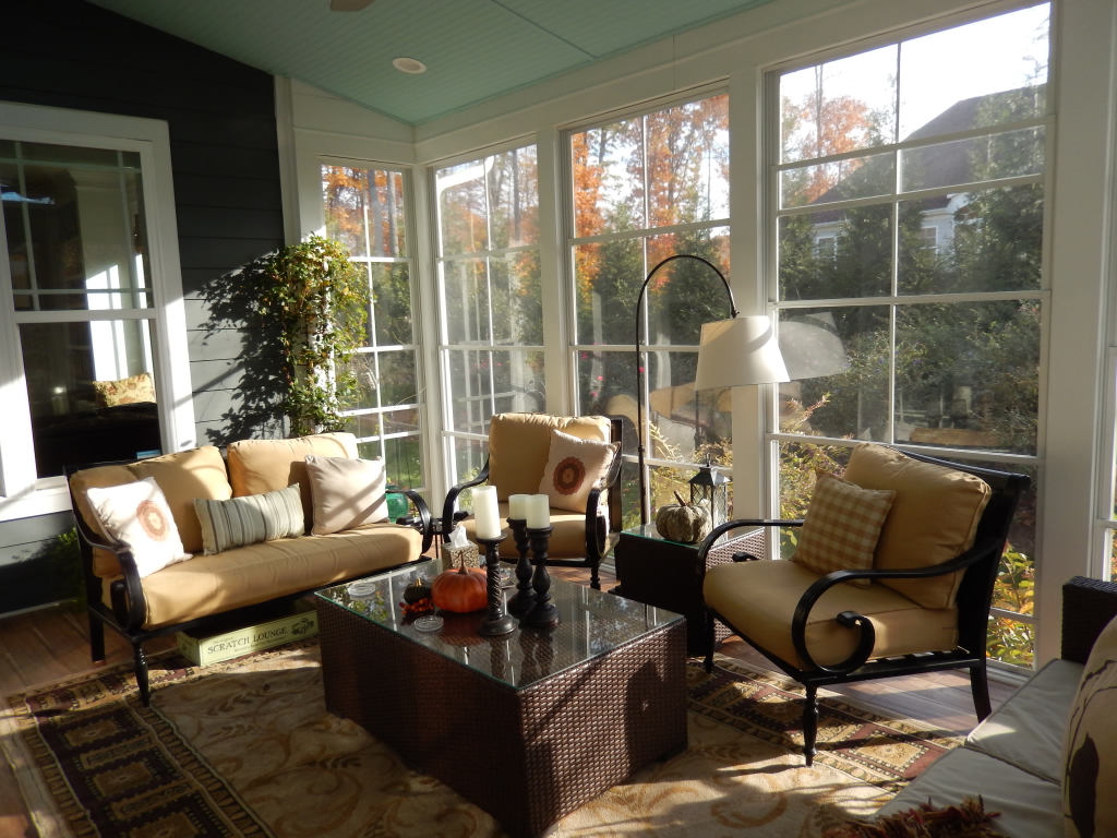 Spring and summer aren’t the only times for great outdoor living. Fall is a wonderful season for enjoying screened porches in Raleigh and Durham. When the summer heat finally breaks, it can be so much more enjoyable to linger longer outside. Relax with a good book or have friends over to enjoy your favorite football game on your new porch, with the beautiful fall colors surrounding you. Special lighting, wiring for entertainment systems, and even a custom fireplace in your screen porch can help you get the most out of screened porch living.