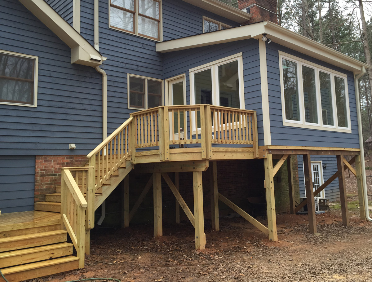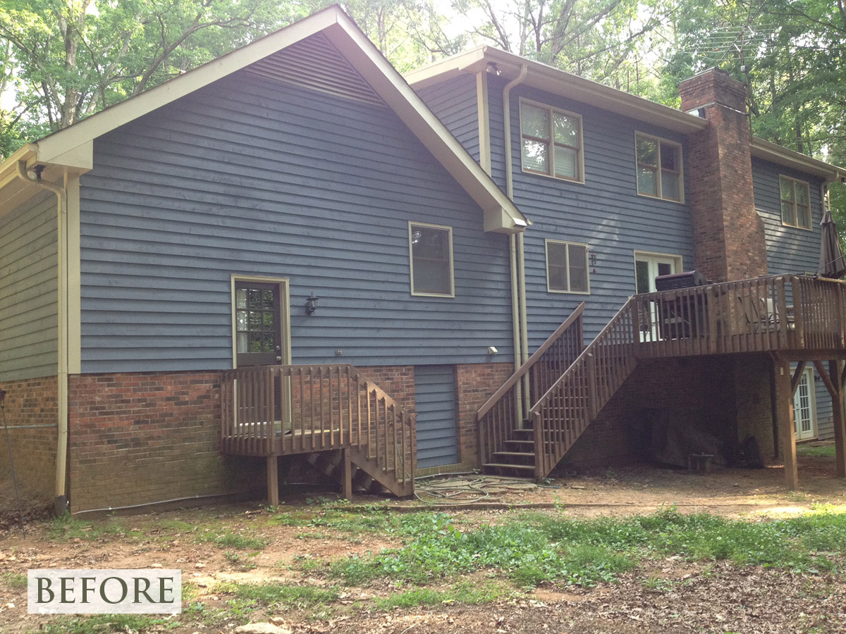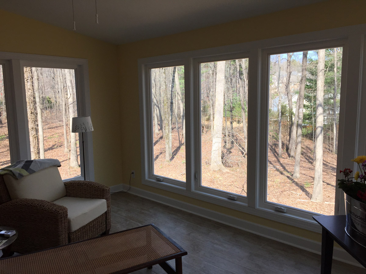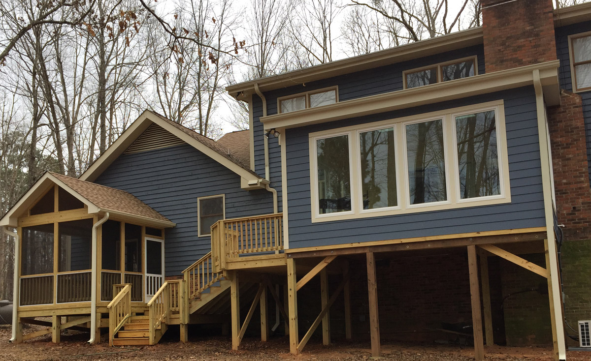 For this Raleigh family, building a sunroom on top of the existing deck helped maximize available space and cut down on costs. We added extra structural support underneath the existing deck to accommodate the new, additional load. After removing the old decking, we installed new sub-flooring and Mannington Seascape porcelain tile (that mimics the look of wood). The sunroom also features floor-to-ceiling Jeld-Wen casement windows and a low-pitch shed roof to allow as much ceiling height as possible, while fitting beneath the second story windows. For the exterior, we were able to match the cream trim and the blue siding perfectly, making this sunroom addition look original to the home.