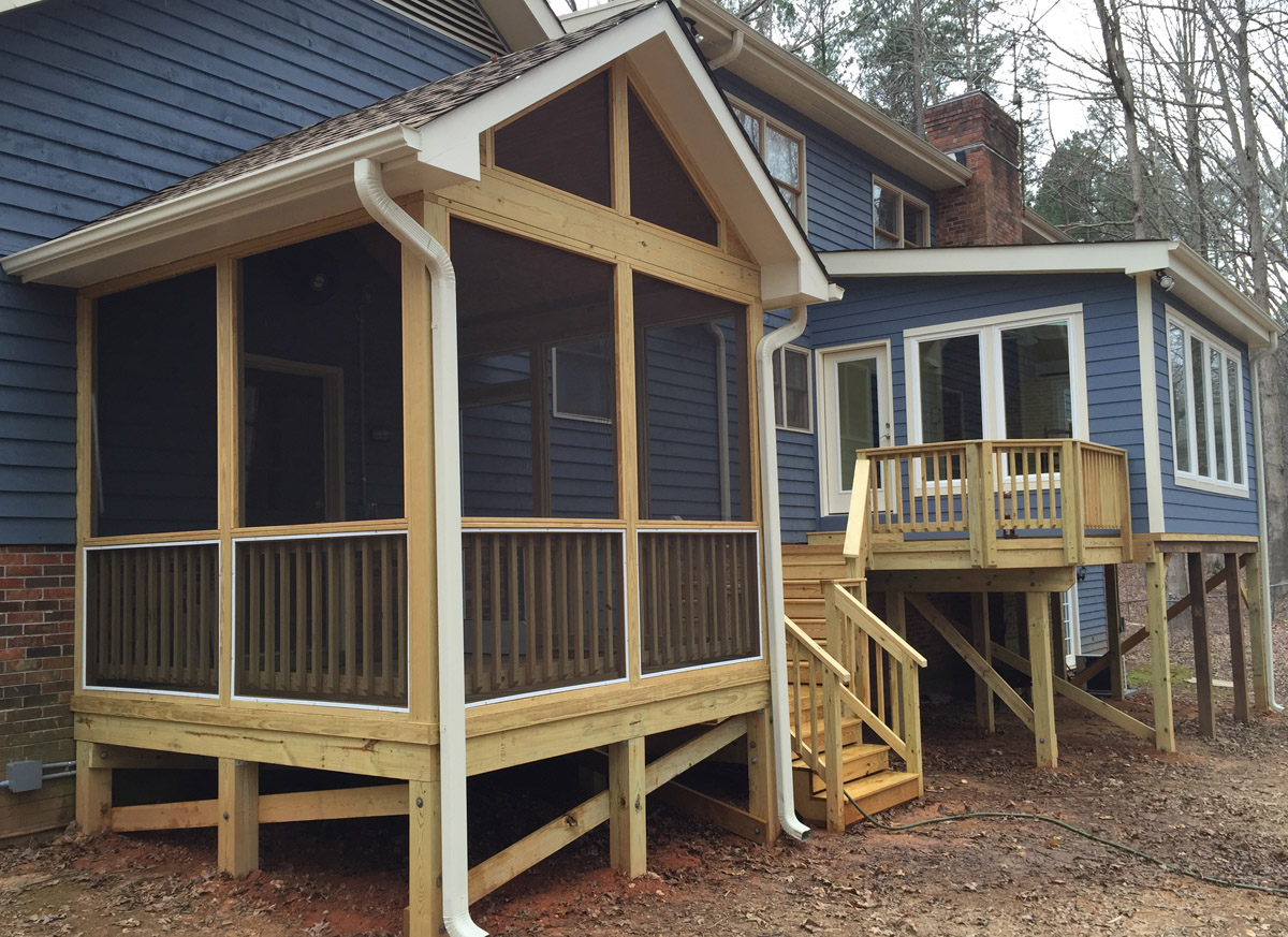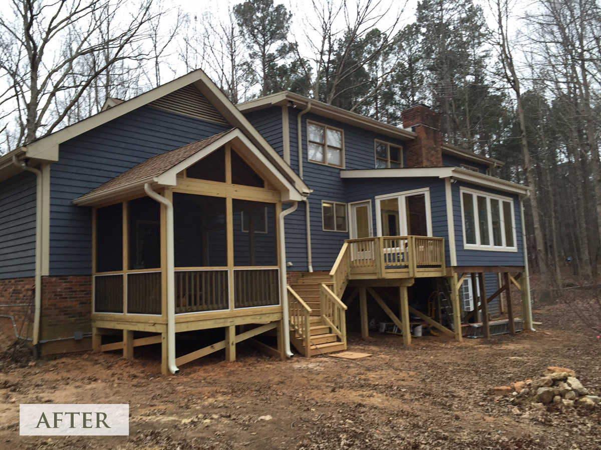To address the husband’s wish for a well-ventilated outdoor space for enjoying cigars, we were able to build a private screened in porch right outside of their home office. The space provides a relaxing and comfortable spot for smoking cigars in rain or shine, while also keeping the smell of smoke from infiltrating the home. The open gable roof of the screened porch matches the pitch of the home’s roofline, further blending the new outdoor structure with the existing home.