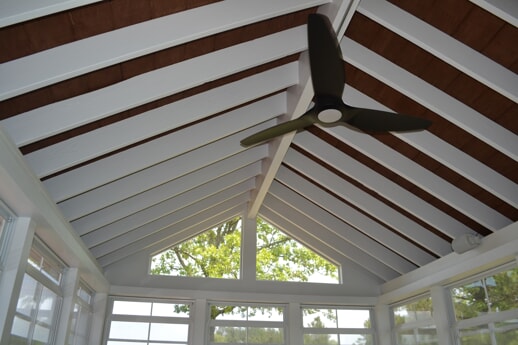 At Archadeck of Raleigh-Durham, details are what make our projects top notch. Notice that the exterior siding on the knee wall matches the siding on the home perfectly, making this 3-season room look original to the home. We also wrapped the columns with AZEK PVC to match the existing white trim of the home and keep with the low-maintenance goals of the homeowners. Eze-Breeze windows and a ceiling fan add to the comfort of the space, no matter what the weather brings.
