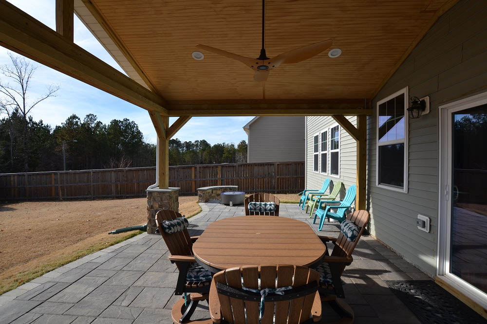 This Durham porch roof features impressive rustic beams and stone wrapped column giving the home’s backyard a rustic charm while achieving their goal of UV protection.
