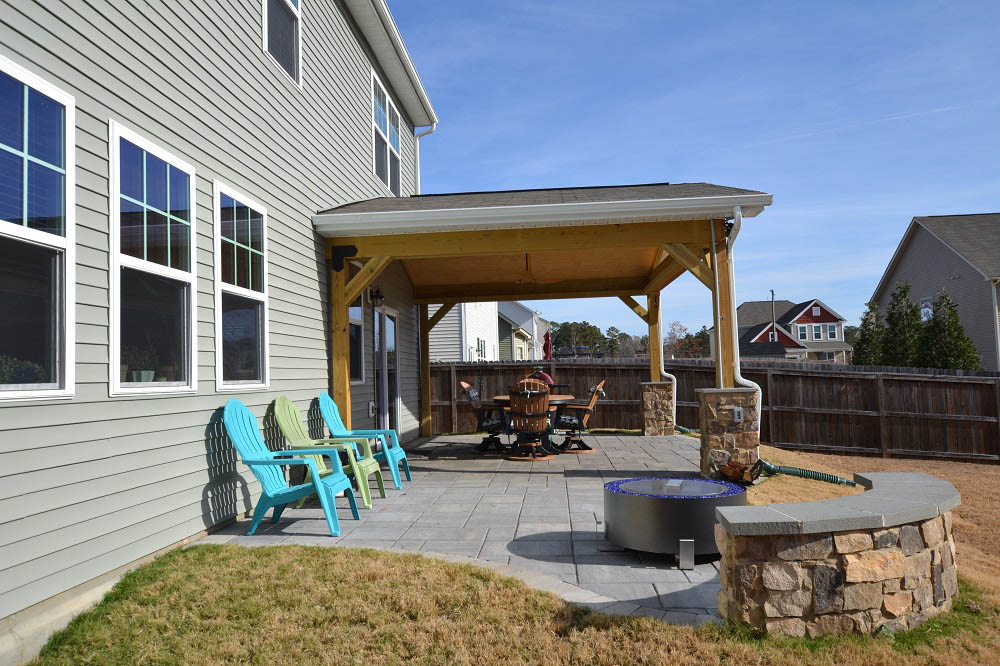 Enjoying this gorgeous Belgard patio in Durham has become much more enjoyable with the addition of a porch roof. The roof provides ample shade and rain protection while exuding rustic charm and style.