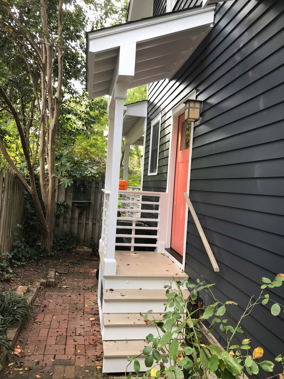 Just because an entrance to a home is on the side doesn’t mean it can’t be the star of the show. The addition of a side porch to match the back porch on this house created a beautiful and useful entry point to the home. For visual harmony, we integrated details from the back porch including the white vertical rails and neutral floor, which are a perfect accent to the striking coral door. Interested?