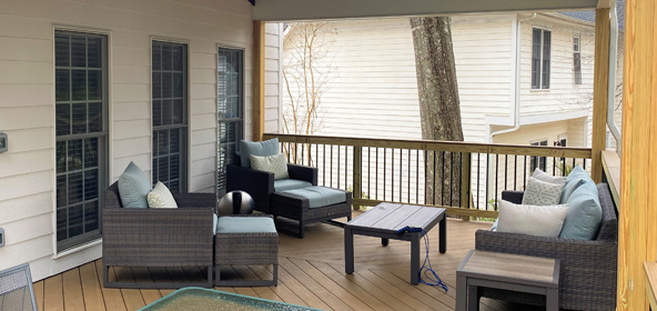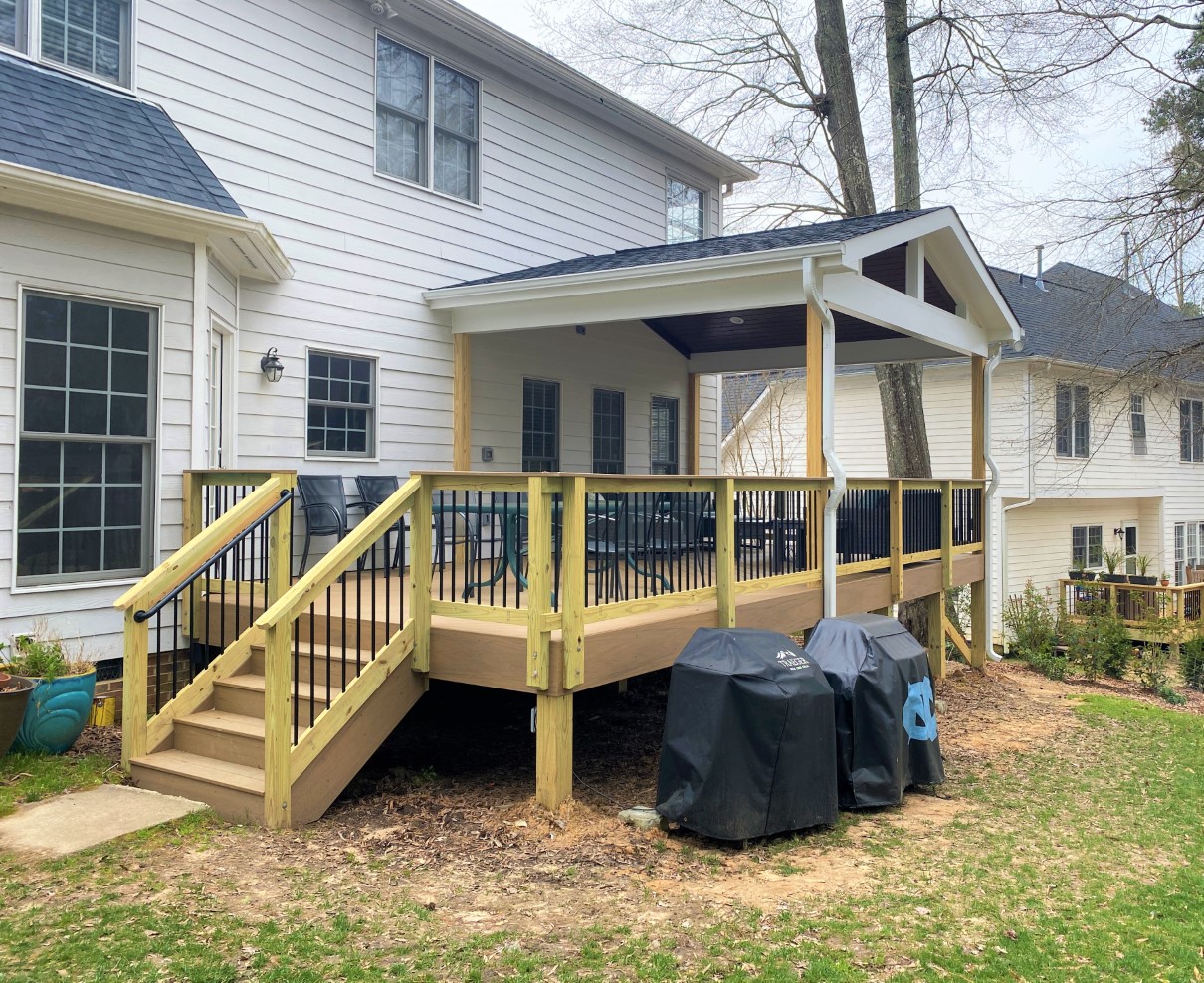 One pair of Durham homeowners recently asked us to expand their deck and add a porch roof. Their existing deck was small and very sunny, making it a tight fit for multiple people to enjoy and rendering it too hot for large portions of the summer.