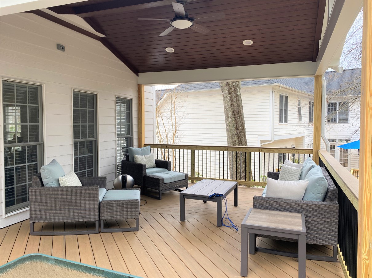 The size of an outdoor space is irrelevant if homeowners can’t use the space for other reasons. In this case, leaving the large deck exposed to hot and inclement weather was not likely to bring much benefit. In order to maximize our clients’ usage of their new deck, we added a porch roof to cover the deck. Additional design details such as a ceiling fan and recessed lighting further enhance the homeowners’ use of the space. Adding the shade structure with all of its amenities provides weather protection, cool breezes, and lighting to help these homeowners to enjoy their deck for more of each day and more of each year.