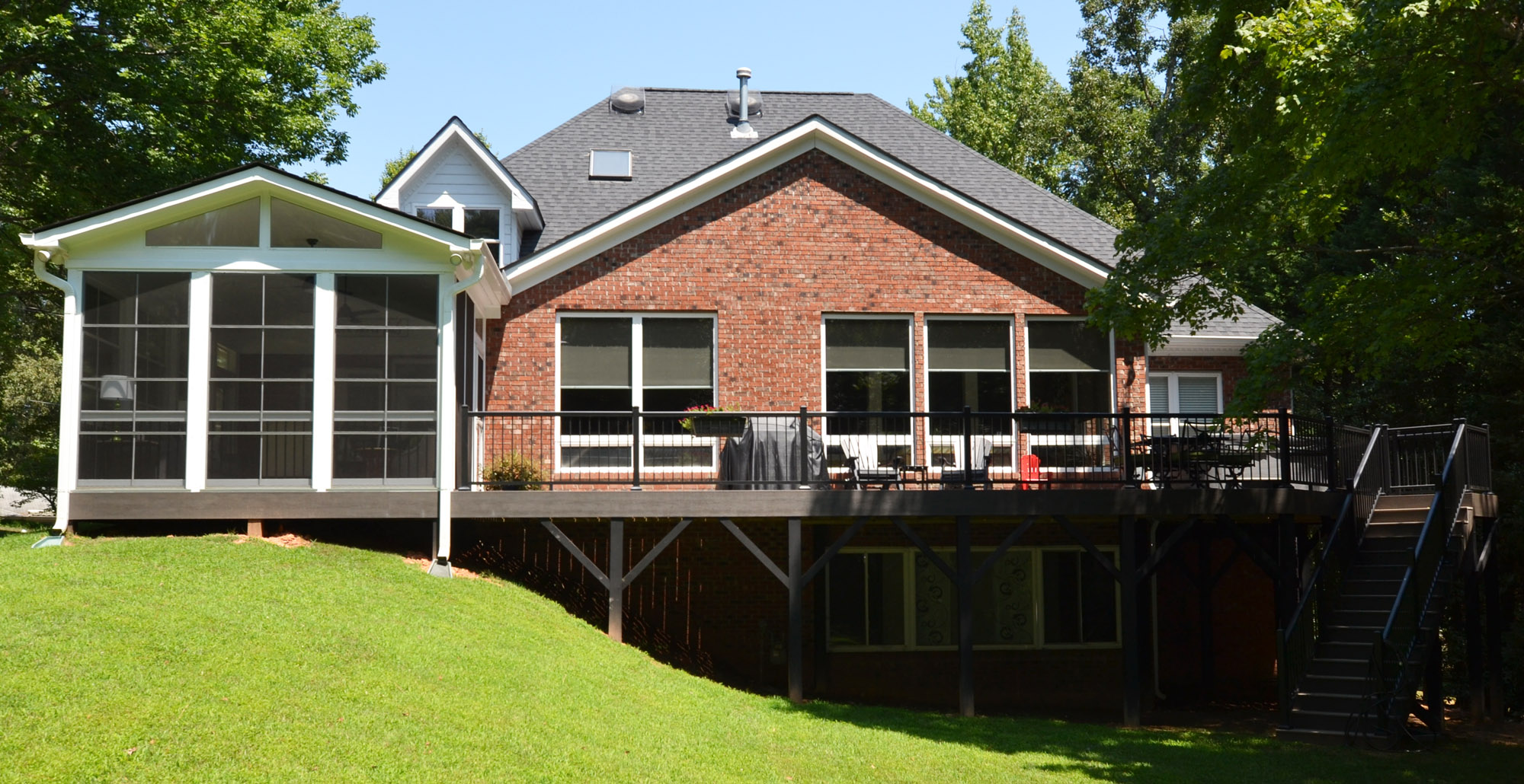 Sloping yards are a common feature of Triangle-area homes. Depending on the pitch and orientation, a slope can make it challenging for homeowners to fully enjoy their property. This is especially true when a slope runs alongside the home, as was the case with one Cary backyard. The homeowners asked us to help maximize usage of their sloping landscape and to provide some protection from the trees surrounding their home. To achieve these goals, we designed and built a composite wrap-around deck with an Eze-Breeze 3 season porch. We also advised the homeowners to arrange for additional grading to eliminate standing water at the foot of the deck stairs.