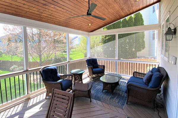 If homeowners are looking to maximize their all-year, all-weather usage of an outdoor living space, converting a deck or porch into a three-season room provides the greatest flexibility. A three-season room is much like a screened-in porch except it also offers the added protection of vinyl porch windows. Our vinyl 4-track windows can be adjusted according to weather, pollen, or preference. When the windows are fully opened, users can enjoy long breezes and a closer connection to the outdoors through screens. When homeowners choose to close the vinyl windows, they can enjoy greater protection from heavy pollen, rain, or cold breezes. If an appropriate outdoor heater is brought in while the vinyl windows are closed, homeowners and their guests can even enjoy winter days in the new space.