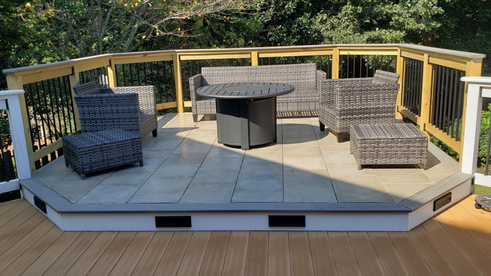 - A two-tiered deck layout—one for grilling and dining, one for relaxing by the fire
