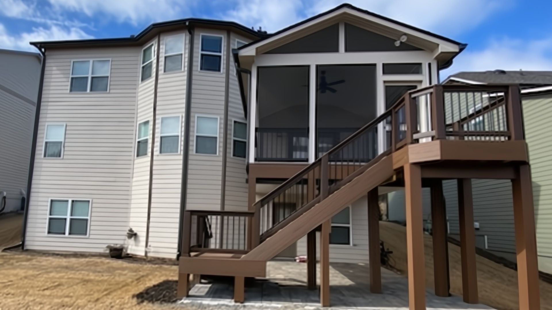 - A 3-season room with a staircase down to a pergola-shaded lounging patio
