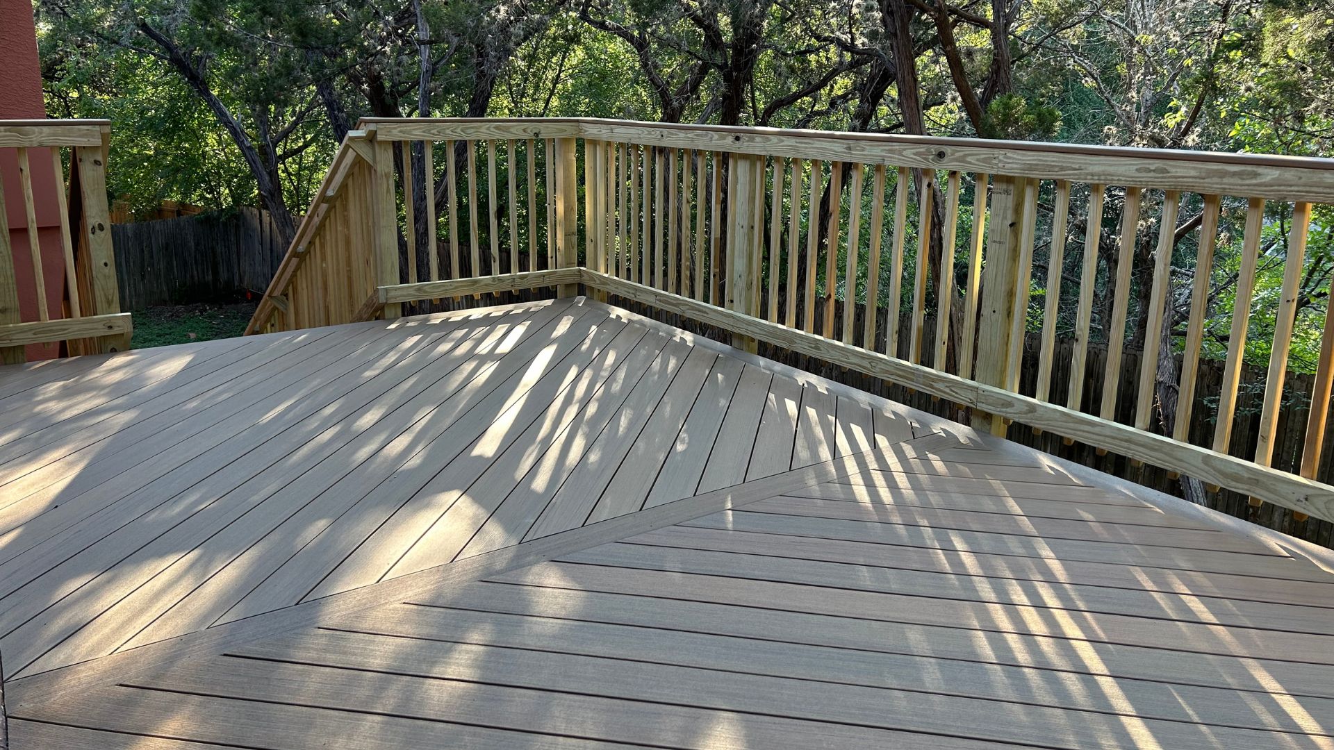 • Perpendicular board patterns that were just that, running perpendicular to the rear of the home, instead of parallel, giving the deck a wider look.