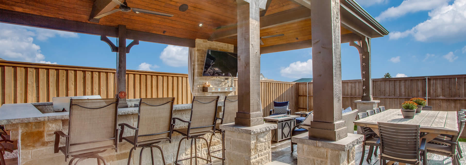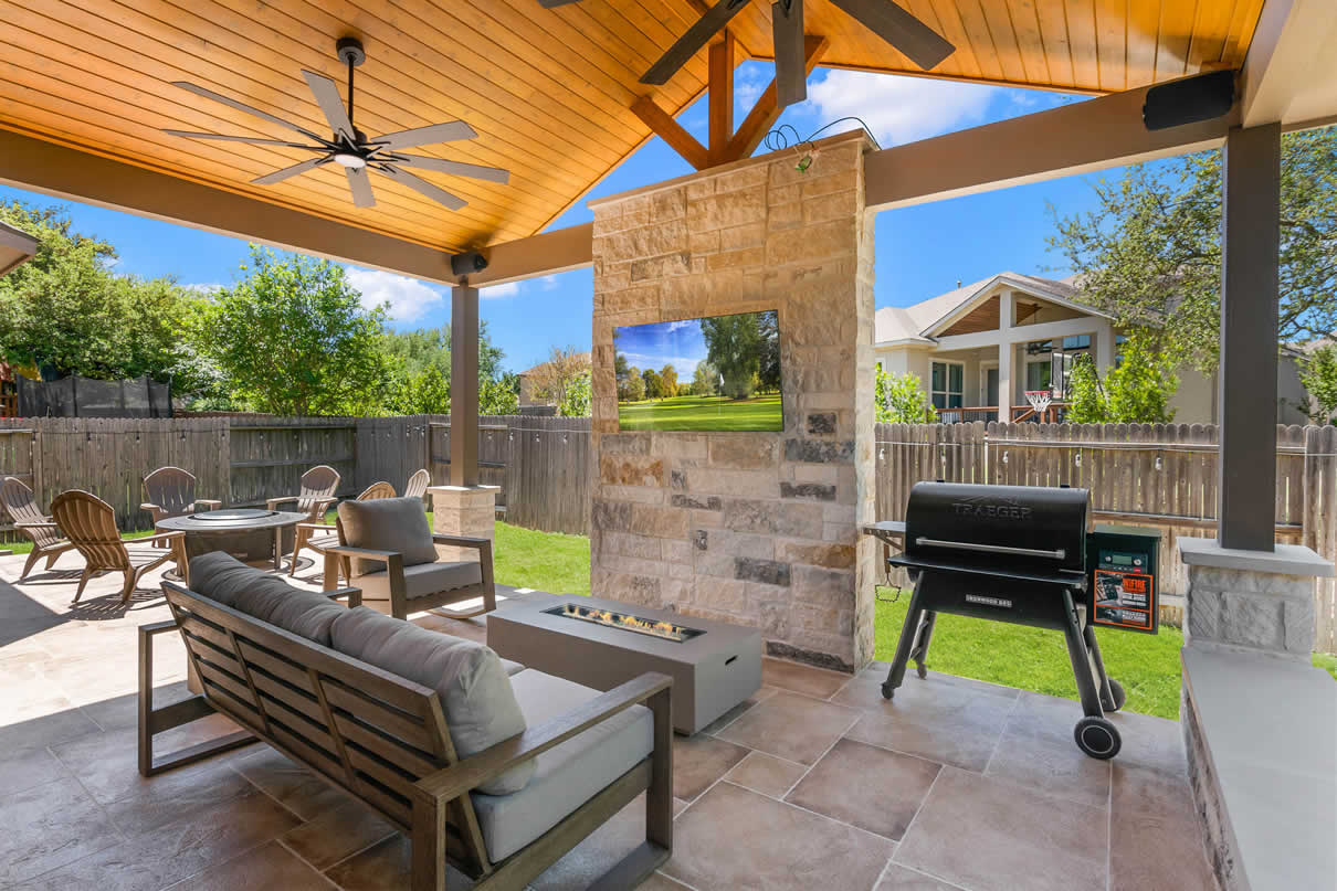 - Improved FUNction: Patio covers afford Hill Country homeowners tons of outdoor living functionality. Our covered patio designs are very often venues for cooking in fully equipped outdoor kitchens, dining outdoors, and for outdoor TV watching. There is hardly a better way to enjoy your home than bringing indoor functions to the outdoors.