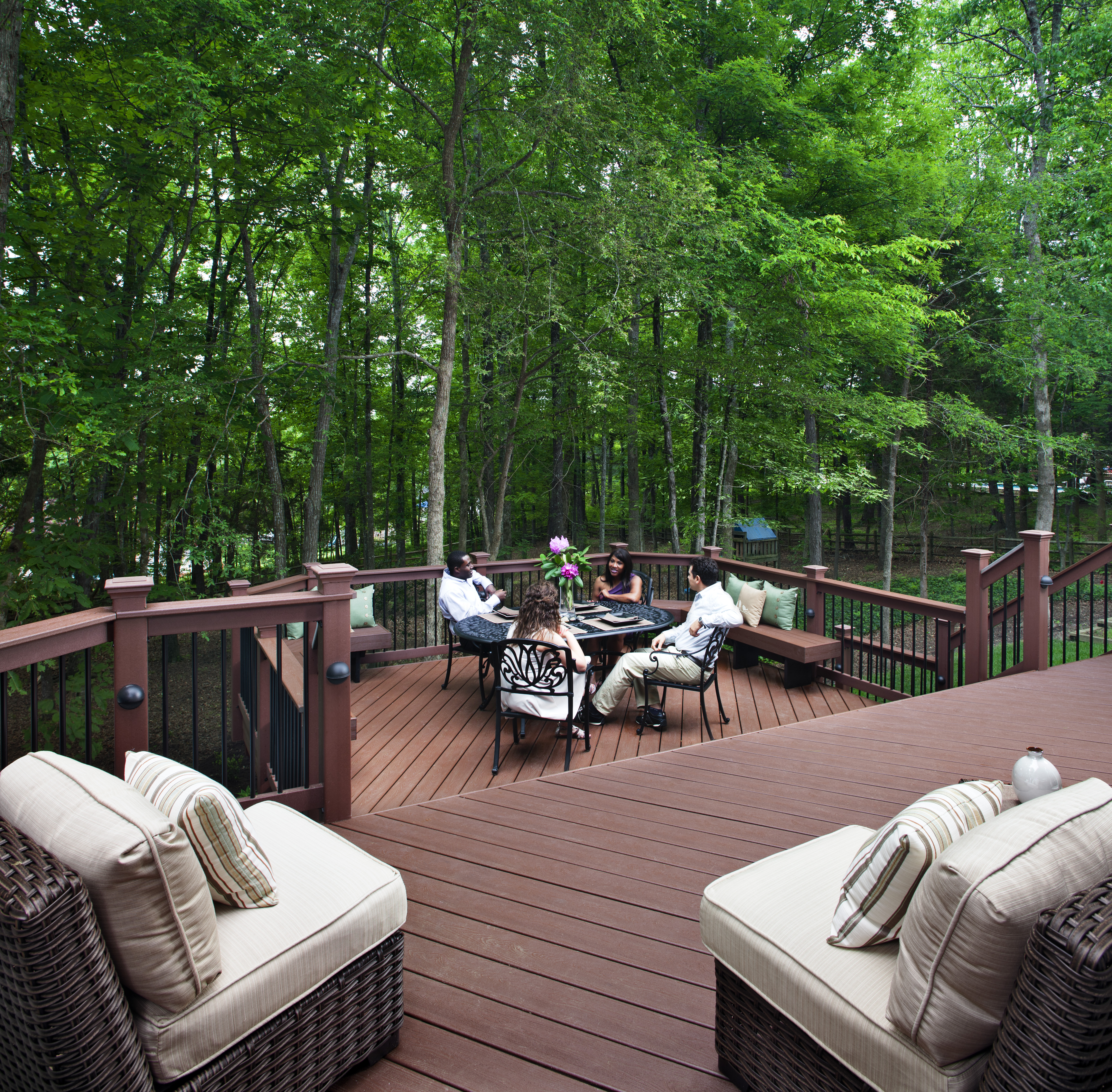 When it comes to deciding what materials to use, it is much more than choosing between wood and composite decking boards. If you choose composite, you have a variety of color choices. Once the decking is chosen, there are many styles, colors, and material options for railings and infill. Someone who loves modern design might choose glass infill for a clear view of the yard from anywhere on the deck or in the house, while a transitional house might look best with aluminum dark gray or black railings for a twist on the traditional with low-maintenance living.