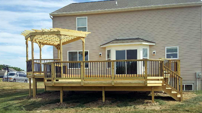 Never fear! Ours and the family’s visions were perfectly in sync, the stars aligned, and we set out to provide them with a premium pressure-treated wood deck with areas for sitting, grilling, eating, and then some. This family will have no problem finding fantastic ways to utilize their deck and pergola for many years to come. There’s enough room for rabblerousing and relaxation! For added beauty and safety, we chose black aluminum picket deck railing by Deckorators.