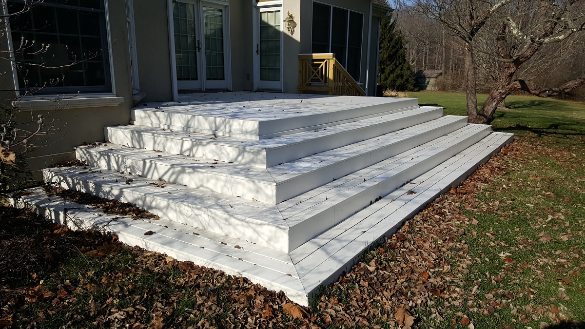 When it came to replacing the existing deck, the homeowners wished to eliminate the need for a space that was enclosed with railings. To accommodate their desire to open up their view, we gave them a new deck surrounded with progressive steps, which allowed us to leave the space unimpeded by railings. The deck takes on the air of a stage, and we imagine this family has set the scene for hours of entertaining and private relaxation in their outdoor living space. Such an open space is apt to be staged for holidays or summertime entertaining with friends and family sitting on the deck or convened on the steps for drinks and conversation. Lest we forget the white finish of this deck will facilitate heat dissipation, so full-sun days on this deck will be more comfortable!