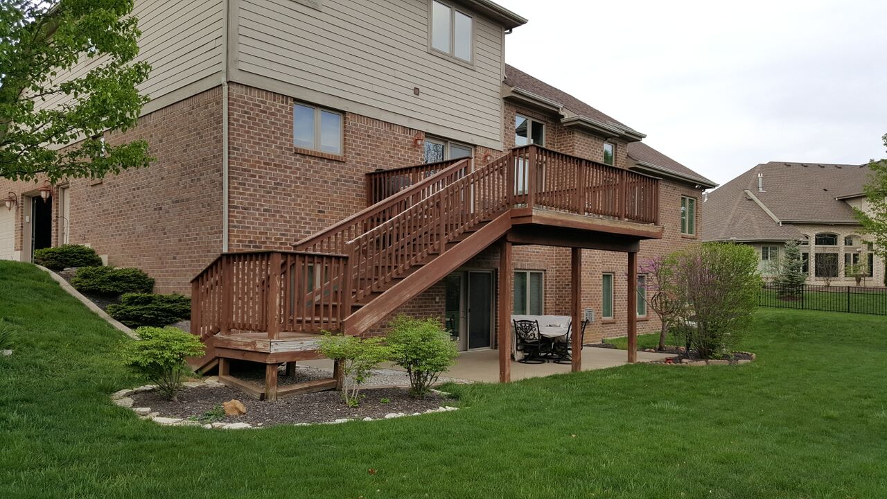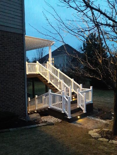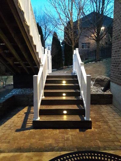 In addition to the redecking and new railings, the homeowners wanted to have a landing built out from the deck leading to two sets of steps. One set leads to the side yard and the other leads to the walkout basement. The landing and steps were also built with Envision decking materials to match the main level of the deck. The deck also includes low voltage Kichler outdoor lighting for ambiance and safety in the evening.