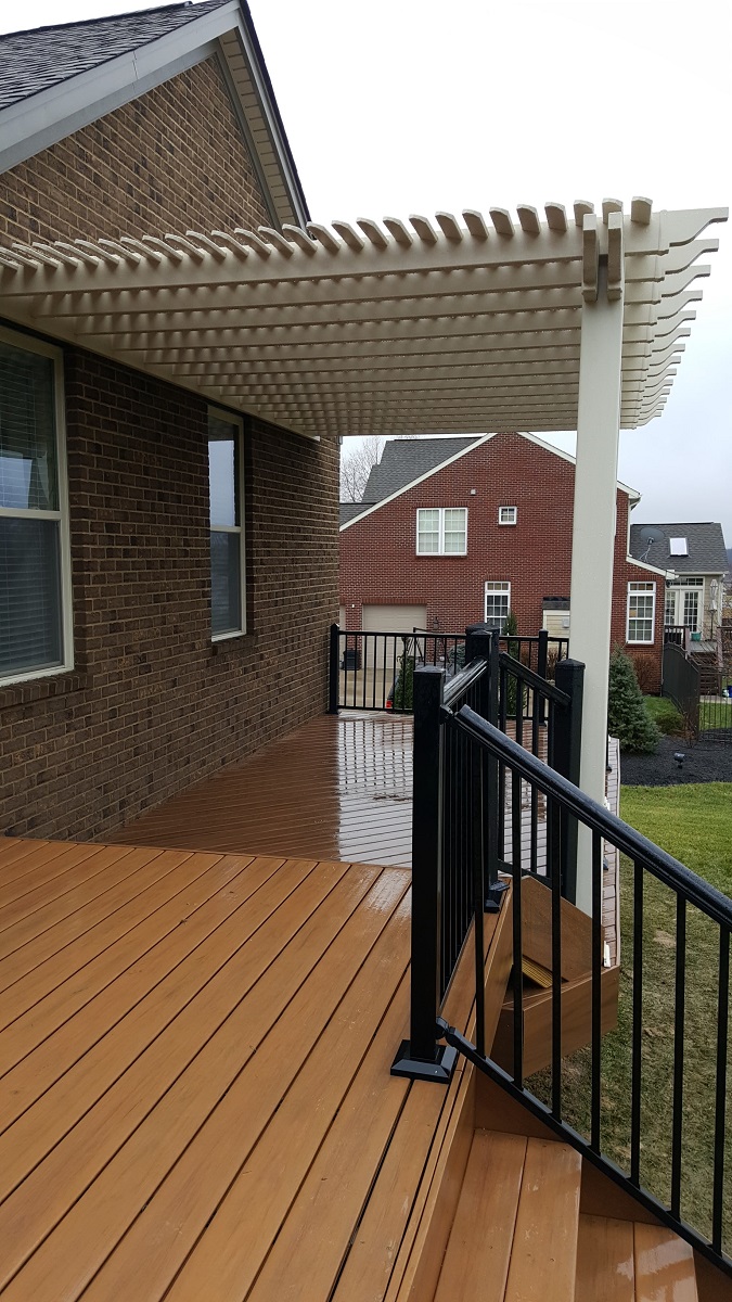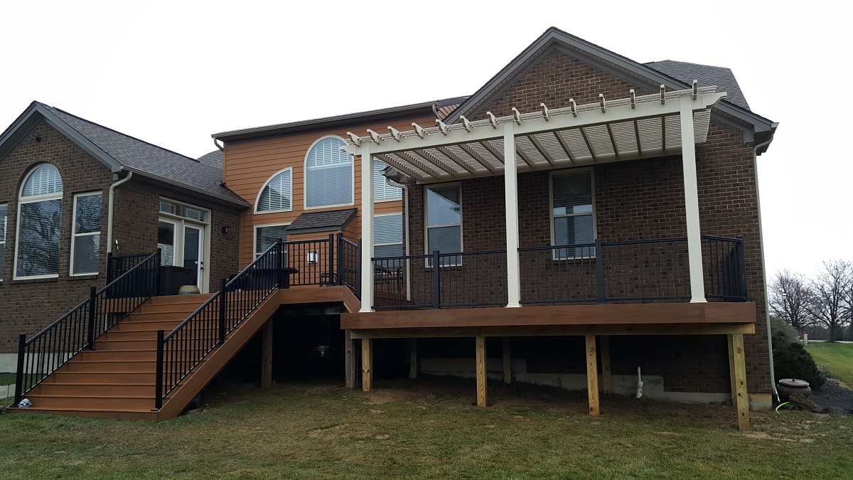 — Clear Creek Township low-maintenance deck and railing with vinyl pergola.
