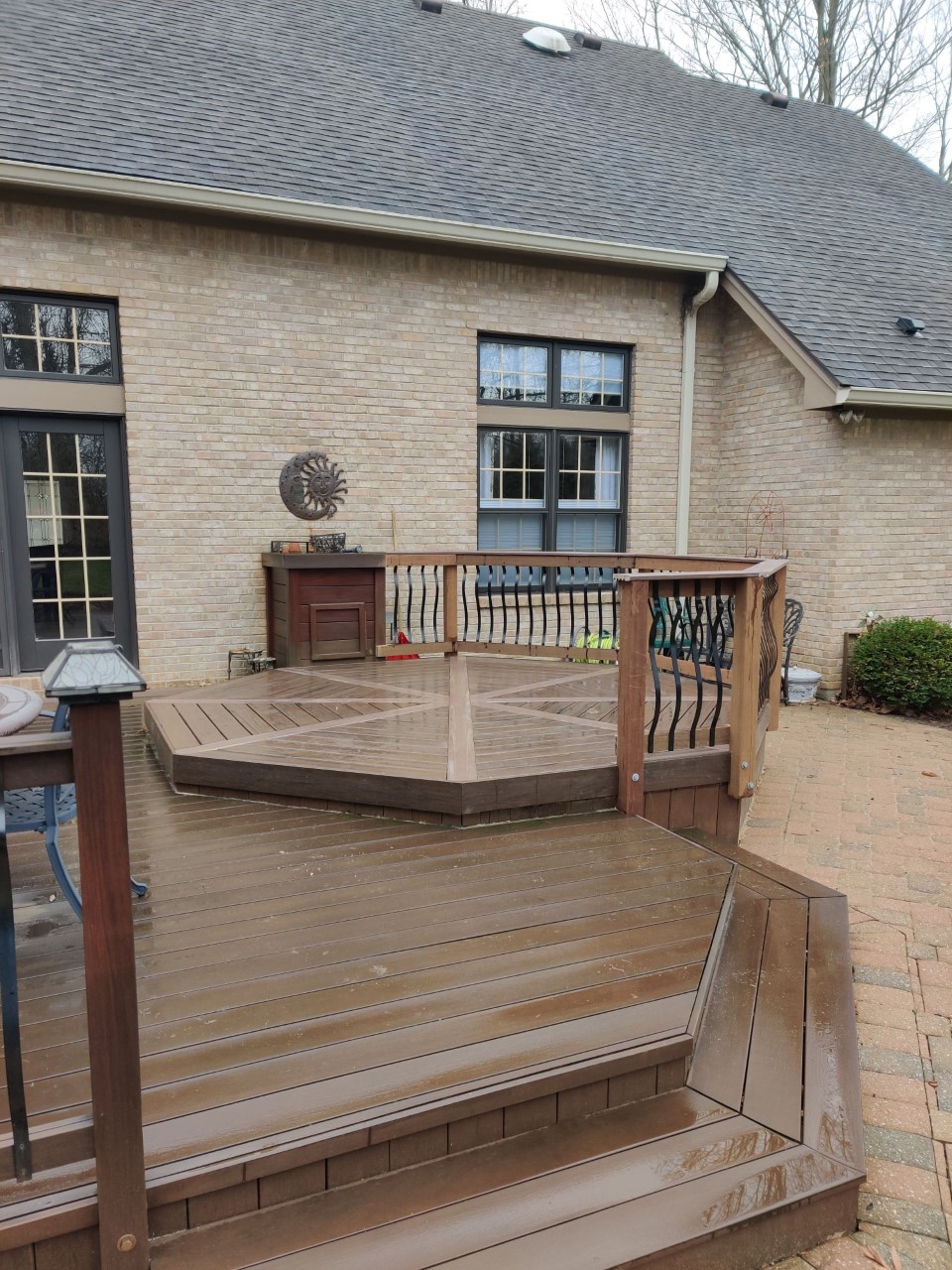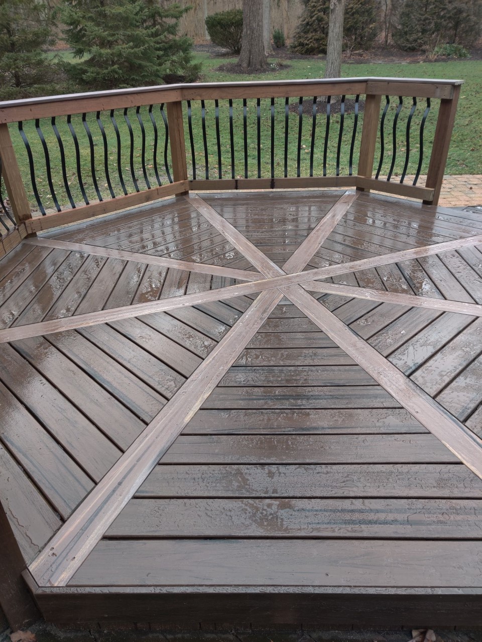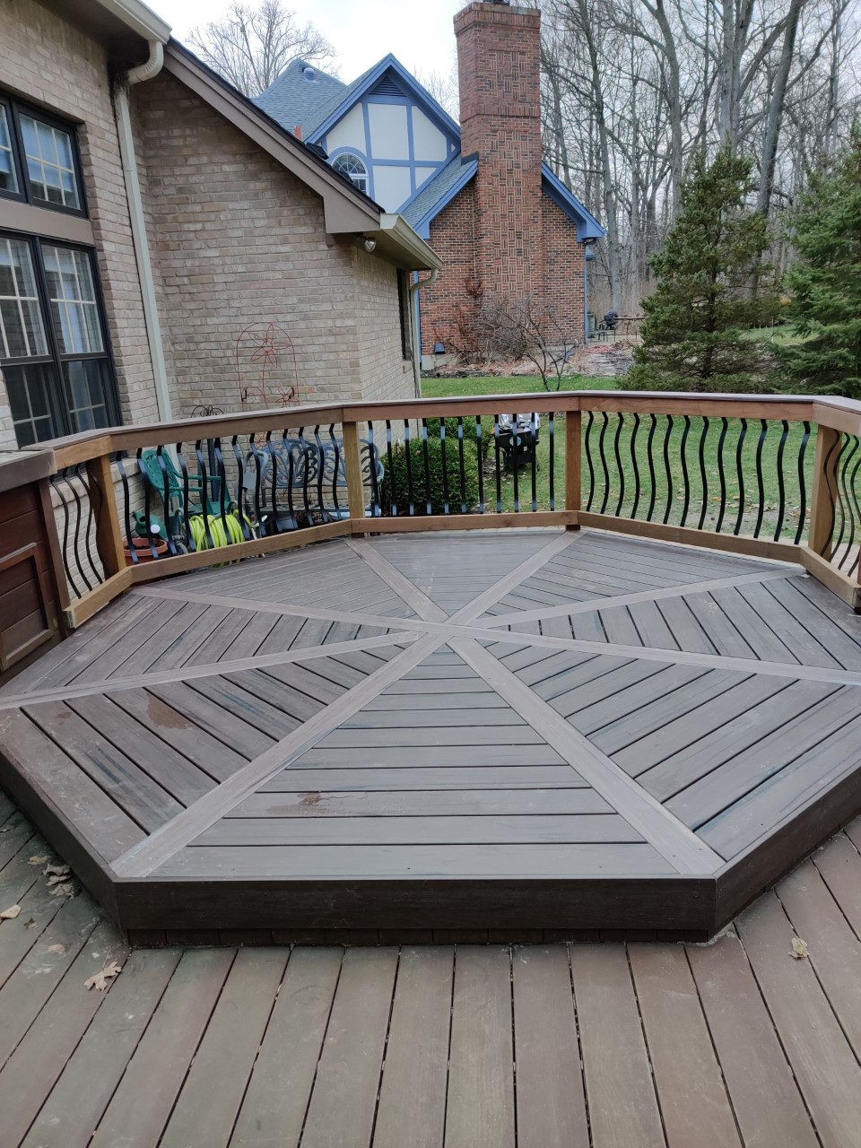 Once the substructure rebuild was completed, we then rebuilt the octagon using low-maintenance Armadillo Lifestyle composite decking in the Campfire color. We also added unique details to the area using Armadillo decking in Foothills for the dividers and Walnut for the beautiful floor inlay.